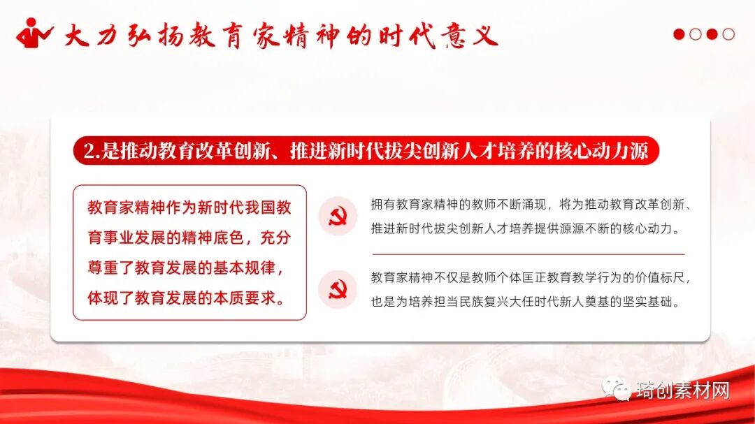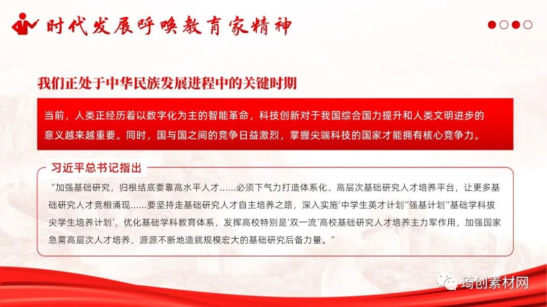 第三、时代发展呼唤教育家精神 我国教育当务之急是在培养德智体美劳全面发展的社会主义建设者和接班人的同时,坚定不移地培养和造就能够支撑国家科技事业和民族未来发展的拔尖创新人才。所以时代呼吁教育家精神的大力践行!