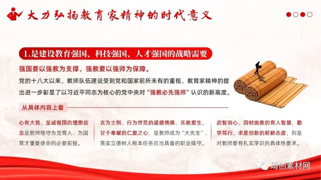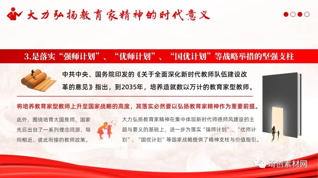 第二、大力弘扬教育家精神的时代意义 大力弘扬教育家精神是建设教育强国、科技强国、人才强国的战略需要,是推动教育改革创新、推进新时代拔尖创新人才培养的核心动力源,是落实“强师计划”、“优师计划”、“国优计划”等战略举措的坚强支柱,是推进高素质专业化创新型教师队伍建设的强大引擎。 1、大力弘扬教育家精神是建设教育强国、科技强国、人才强国的战略需要